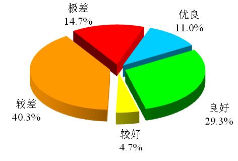 地下水質(zhì)量狀況不容樂觀,水質(zhì)為優(yōu)良-良好-較好的監(jiān)測點總計為1759個,占部監(jiān)測點的42.8%, 2351個監(jiān)測點的水質(zhì)為較差-差,占部監(jiān)測點的57.2%。